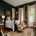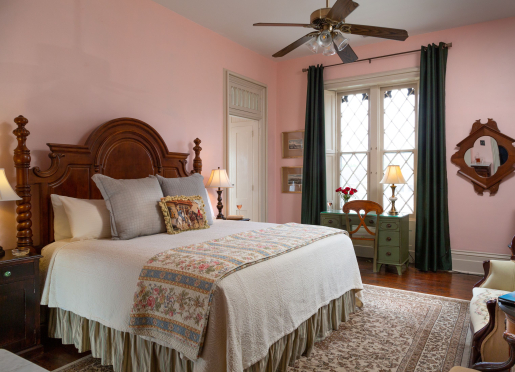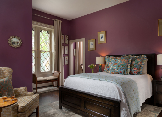 Located on the second floor this elegant room features a king bed, rose, green and taupe colors, and a super-spacious bath with tub and shower. Huge windows make this room bright and sunny, while the dark wood vanity and pillars surrounding the tub and oak leaf wallpaper give the bathroom an English manor feel.
