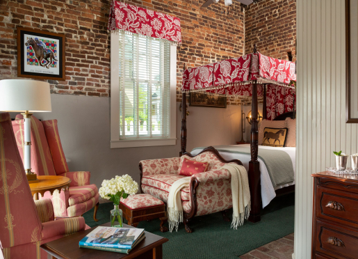 Located on the first floor an exceptional room with 20-foot-tall exposed brick walls, toile bed linens, and a private entrance and patio. Features include a queen canopy bed, and a double spa tub and shower in the bath. Elegant, romantic and fun, this room presents a whimsical theme of horses, chickens, and bees.