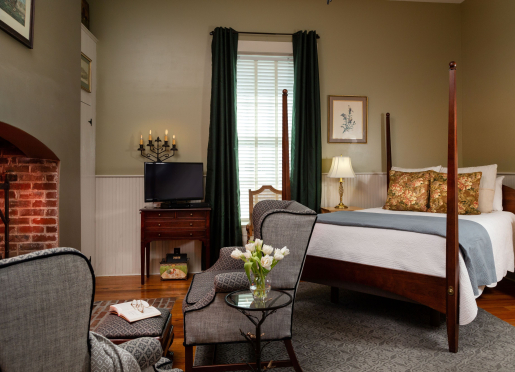 Located on the first floor this is a beautiful room with queen canopy bed facing a 10-foot wide gas fireplace. Features a 12-foot-high ceiling, a single whirlpool tub, a shower in the bath, and a sitting area in front of the fireplace. Rich tones of teal, rose and green. The cooking kitchen in 1853, the Hearth Room fireplace, beadboard and teal paint on the walls are exact copies of the original.