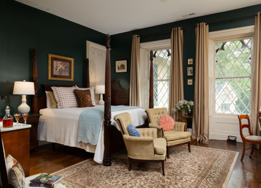 Located on the second floor our spacious Master Suite features a queen, four-poster bed, private balcony, and sitting room with a sofa that converts to a full size bed for two. The bath features a 10-foot-tall steam shower with gothic tile. Warm brick red walls, Victorian hot air balloon wallpaper, and American Gothic furniture give this room old world charm. Relax on your private balcony.