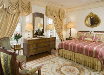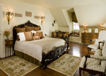 The imported London silk shades and window seats with brocade pillows allow guests to lounge. The room is exquisitely furnished with rich rugs that complement the warm glow of the fire. With furniture such as an antique settee and hand carved table, you have a completely indulgent and romantic atmosphere to celebrate your partner.