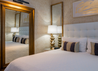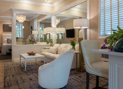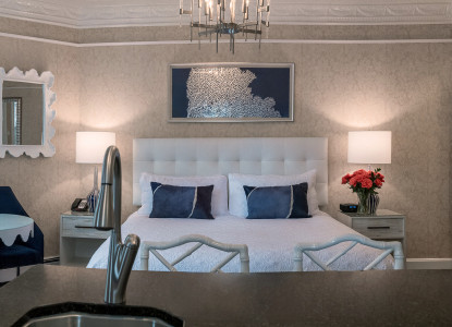 Ideal up to two adult guests only. The Penthouse Parlor features one king bed, an in-room whirlpool tub, and a spacious bathroom with a walk-in rain shower. This room is located on the third floor of our Chateau Villa.