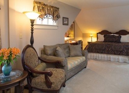 This is the largest guestroom in our Asheville bed and breakfast Inn near downtown, featuring a plush king size bed. This private, third floor room provides an airy, spacious, treetop retreat. Kick back and relax in our two wing back chairs in front of the electric fireplace with a good book and your favorite beverage. A make-up dresser area is located on the way to the private bathroom. The Suite has its own central heating and air conditioning system for your comfort.