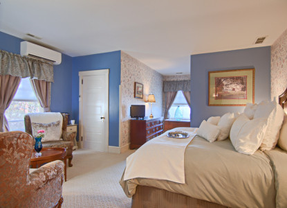The inviting Magnolia Room features mahogany furniture and a gas fireplace, creating a warm, elegant look, perfect to relax after a day of touring Biltmore Estate. The walls lavender and the king bed skirt and window treatments add brightness to this, our most popular guestroom, located on the second floor of our Asheville bed and breakfast.