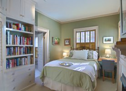 Come enjoy this cozy, delightfully bright guestroom with a queen bed, shuttered windows everywhere and bookcases on two walls. There are plenty of books to browse! The adjoining bathroom features a tile floor and a claw-footed bathtub salvaged during the restoration. (The fireplace is ornamental.) Come join us in a terrific room conveniently located on the first floor of our historic bed and breakfast in Asheville.