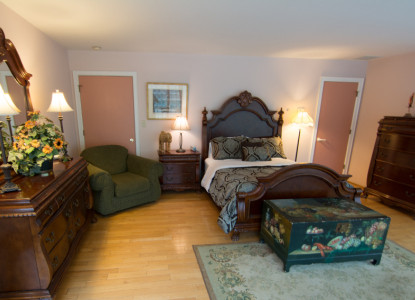 Feel like a king after a night in this room. You will experience the meaning of "True Luxury" with an 18th century setting. All furniture is either hand-cut Mahogany or antiques. From your king size bed you can enjoy the firelight from your gas log set encased by your 280 year old Italian marble mantle from overseas. The room is surrounded by romantic dimming lights on the walls. Relax on the huge private deck overlooking the woods.