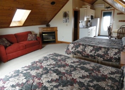 When entering the Pine Loft, you will notice the rich hues borrowed from nature; the warm earth tones accent the pine, A-frame ceiling with two skylight windows. Returning guests will see the upgrades made in 2012: larger deck, expanded kitchenette area with bigger refrigerator, new flooring, ductless air conditioning and more lighting.