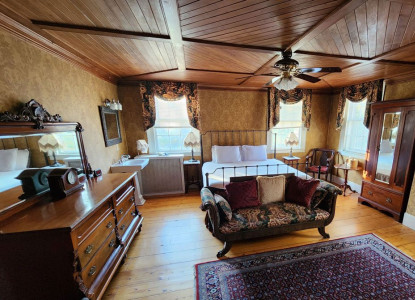 This large second floor room offers a king bed in front of the fireplace, sitting area with a twin pullout sofa sleeper. The bath has a tub/shower combination.
