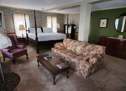 This room features a beautiful queen four poster bed. Bathroom has a standard tub/shower. Private Patio & Pet Friendly.