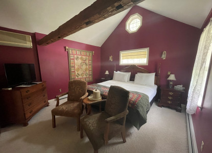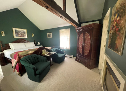 This second floor room has a King bed with a sitting area in front of a Vermont Casting's Stove Fireplace. The bathroom offers a standard tub/shower. There is a large, pedestal sink in the bedroom.