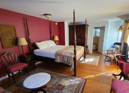 Located in our Parsonage House, this suite offers a king bed, quessn trundle bed and sitting area. There's a kitchenett and private patio. Tiled bath with radiant heated floors and a beautiful walk-in tiled shower.