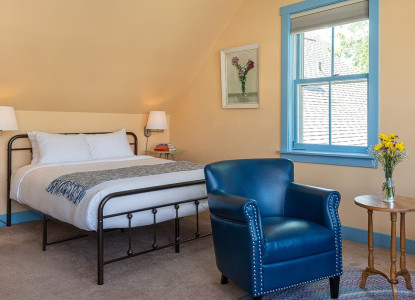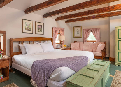 Escape to our cozy second-floor studio suite, ideal for a romantic Vermont getaway. This charming room features an old-fashioned iron bed, plush robes, and a versatile seating area that doubles as a dining space. A kitchenette and private bathroom with a walk-in shower complete this inviting retreat.