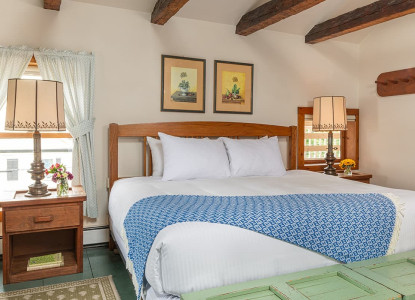 Looking for the perfect Vermont escape for your family or group? This third-floor room boasts a king bed, two twin beds, and a private bathroom. Relax in the spacious seating area beneath the impressive cathedral ceiling with skylights. Enjoy the beautiful Main Street views from the room's three windows.