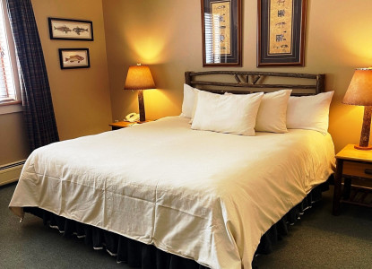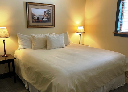 The Harter room is a cozy suit which features a king bed in a private closed off bedroom, a jacuzzi tub and a bathroom with a standup shower. This room does not have a view of the lake.